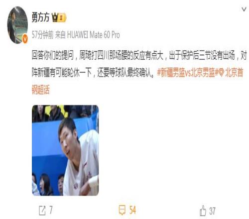 对此,媒体人勇方方如今表示:“回答你们的提问,周琦打四川那场腰的反应有点大,出于保护后三节没有出场,对阵新疆有可能轮休一下,还要等球队最终确认。”