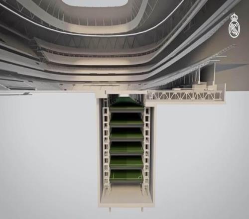 球场被分成六个部分,每部分宽11.67米,长107米。当需要更换时,一个惊人的工程技术使它们可以整齐地折叠到地下深处。这使得皇马能够快速高效地更换比赛场地,或换成其他用途的场地。